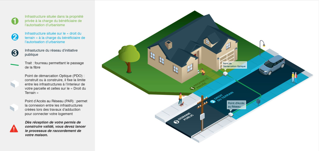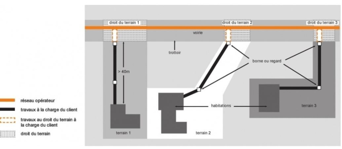 Pour les nouvelles constructions, le raccordement à la fibre optique peut parfois nécessiter la réalisation d’infrastructures de génie civil sur votre parcelle et/ou sur le domaine public (voir schéma ci-dessous), il s'agit des travaux d'adduction.